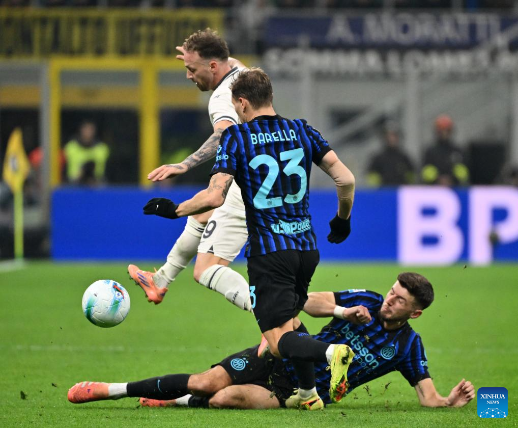Inter Milan's Nicolo Barella (C) and Peter Sucic (bottom) vies with Lazio's Manuel Lazzari during a Serie A football match between Inter Milan and Lazio in Milan, Italy, Nov. 9, 2025. (Photo by Alberto Lingria/Xinhua)