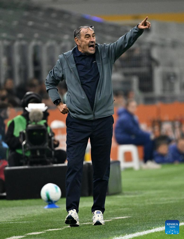 Lazio's head coach Maurizio Sarri gestures during a Serie A football match between Inter Milan and Lazio in Milan, Italy, Nov. 9, 2025. (Photo by Alberto Lingria/Xinhua)