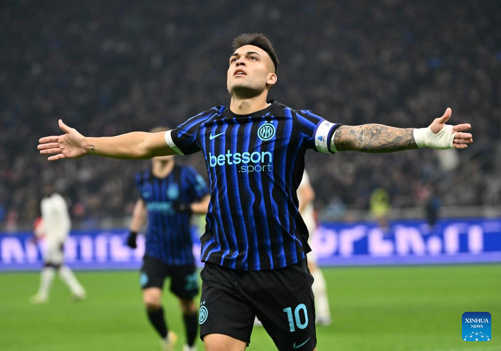 Inter Milan's Lautaro Martinez celebrates his goal during a Serie A football match between Inter Milan and Lazio in Milan, Italy, Nov. 9, 2025. (Photo by Alberto Lingria/Xinhua)
