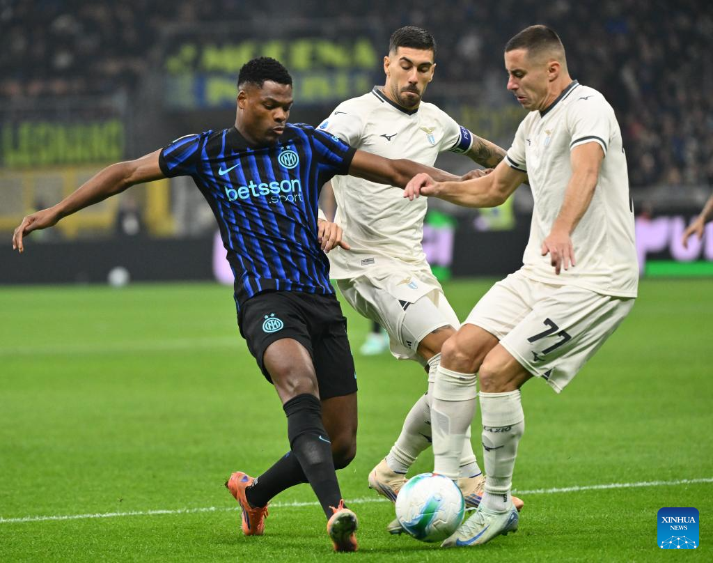 Inter Milan's Denzel Dumfries (L) vies with Lazio's Adam Marusic during a Serie A football match between Inter Milan and Lazio in Milan, Italy, Nov. 9, 2025. (Photo by Alberto Lingria/Xinhua)