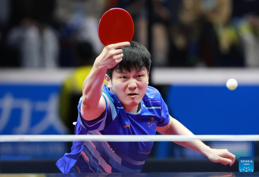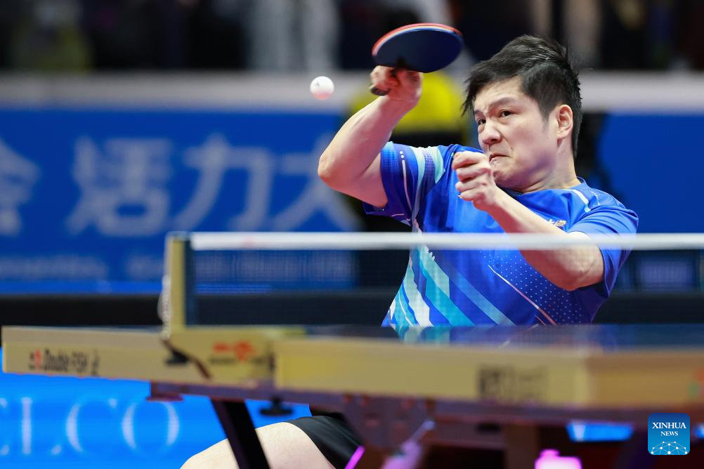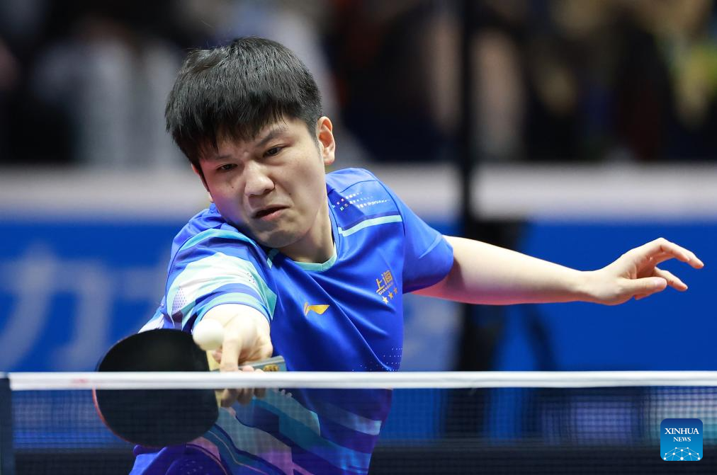 Fan Zhendong hits a return during the table tennis men's singles round of 32 match between Fan Zhendong of Shanghai and Zhou Yu of Hebei at China's 15th National Games in Macao, south China, Nov. 10, 2025. (Xinhua/Liu Xu)