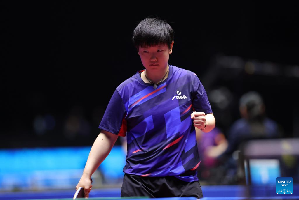 Sun Yingsha celebrates scoring during the table tennis women's singles round of 32 match between Sun Yingsha of Hebei and Liu Weishan of Tianjin at China's 15th National Games in Macao, south China, Nov. 10, 2025. (Xinhua/Liang Xu)