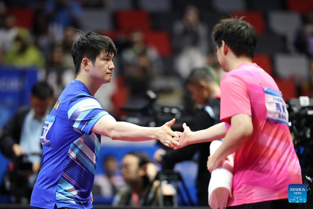 Fan Zhendong (L) of Shanghai shakes hands with Zhou Yu of Hebei after their table tennis men's singles round of 32 match at China's 15th National Games in Macao, south China, Nov. 10, 2025. (Xinhua/Liu Xu)