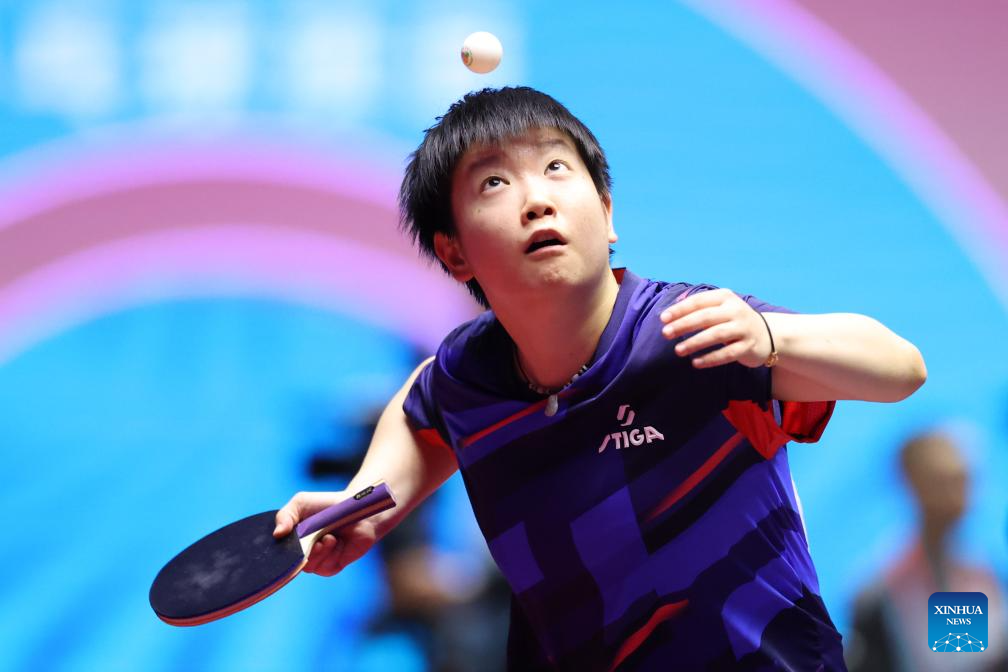 Sun Yingsha hits a return during the table tennis women's singles round of 32 match between Sun Yingsha of Hebei and Liu Weishan of Tianjin at China's 15th National Games in Macao, south China, Nov. 10, 2025. (Xinhua/Liang Xu)