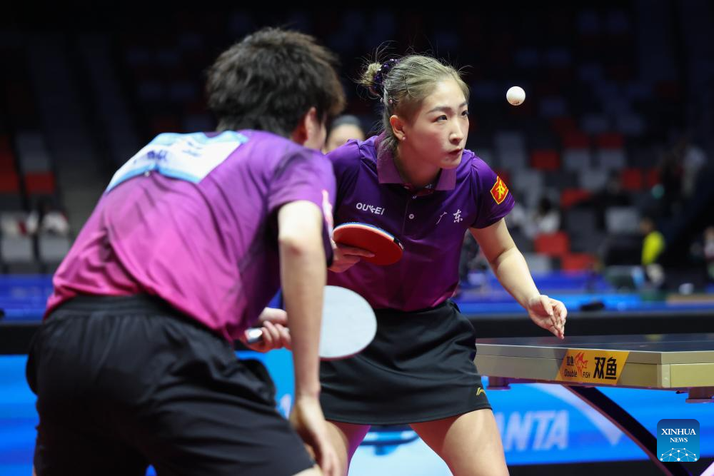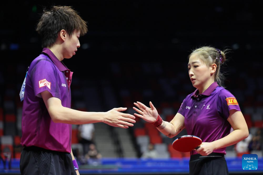 Lin Gaoyuan/Liu Shiwen (R) compete during the table tennis mixed doubles round of 16 match between Lin Gaoyuan/Liu Shiwen of Guangdong and Yiu Kwan To/Ng Wing Lam of Hong Kong at China's 15th National Games in Macao, south China, Nov. 10, 2025. (Xinhua/Liu Xu)