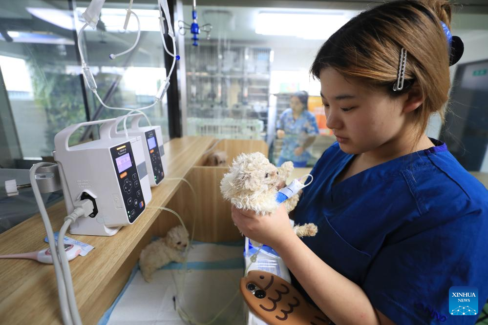 A staff member tends a dog patient at a pet hospital in Tiexi District of Anshan, northeast China's Liaoning Province, Nov. 7, 2025. In recent years, Anshan, a traditional industrial city, has gained new vitality with the development of a distinctive pet industry cluster that spans pet carrier manufacturing, food processing, and grooming services. (Xinhua/Yang Qing)
