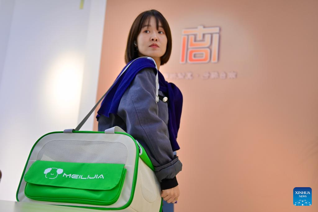 Pet carrier products are pictured in Nantai Township of Haicheng City in Anshan, northeast China's Liaoning Province, Oct. 21, 2025. In recent years, Anshan, a traditional industrial city, has gained new vitality with the development of a distinctive pet industry cluster that spans pet carrier manufacturing, food processing, and grooming services. (Xinhua/Wu Qinghao)