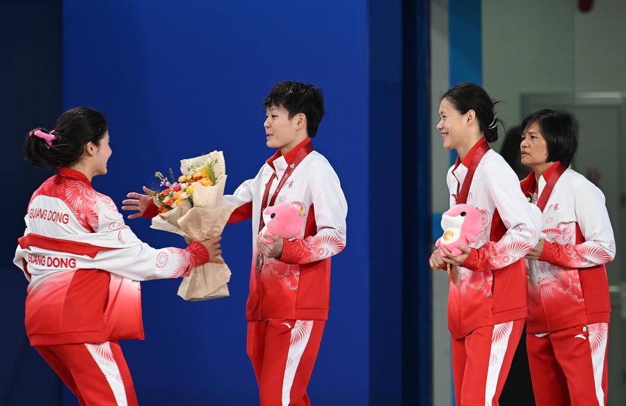 GUANGZHOU, Nov. 11 (Xinhua) -- Olympic champion Chen Yiwen stunned spectators on Tuesday night when she finished only third in the women's 3m springboard final, earning a bronze medal for Guangdong Province at China's 15th National Games.