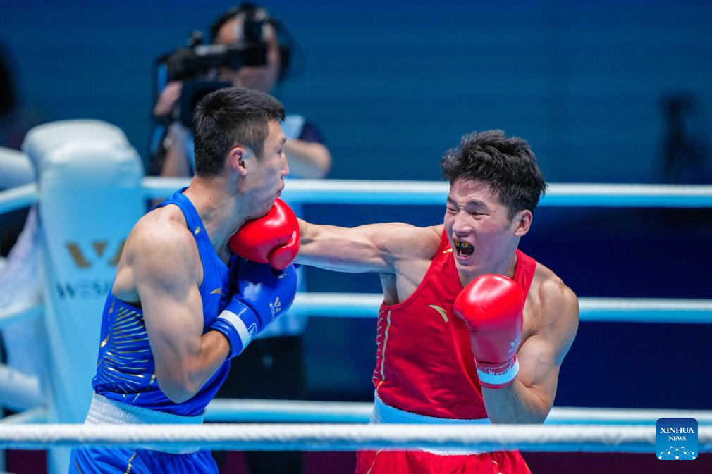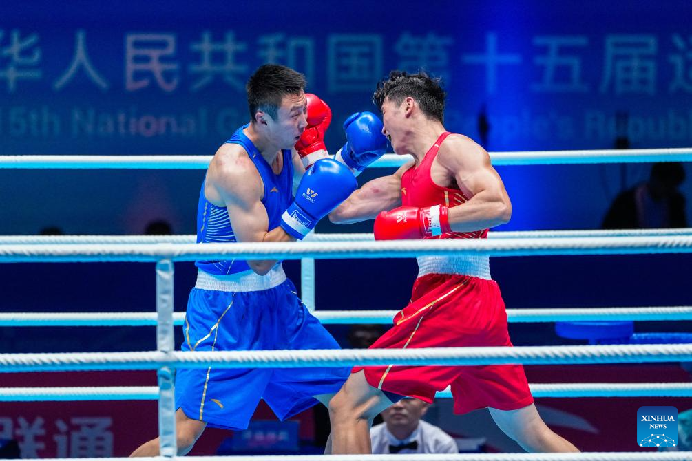 Wang Xiaobao (R) of Sichuan competes against Wang Jinxiang of Shandong Sport University during the men's 80kg final of boxing at China's 15th National Games in Shenzhen, south China's Guangdong Province, Nov. 11, 2025. (Xinhua/Peng Yikai)