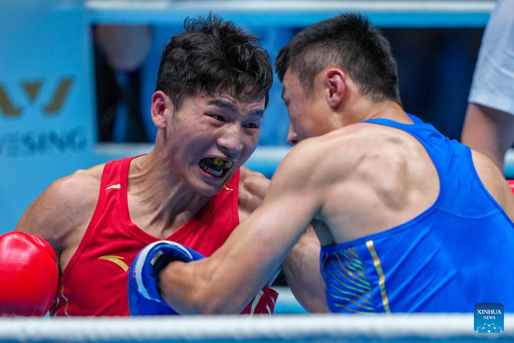 Wang Xiaobao (L) of Sichuan competes against Wang Jinxiang of Shandong Sport University during the men's 80kg final of boxing at China's 15th National Games in Shenzhen, south China's Guangdong Province, Nov. 11, 2025. (Xinhua/Peng Yikai)