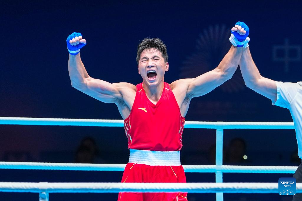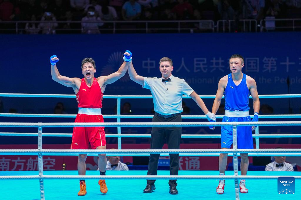 Wang Xiaobao of Sichuan celebrates after defeating Wang Jinxiang of Shandong Sport University in the men's 80kg final of boxing at China's 15th National Games in Shenzhen, south China's Guangdong Province, Nov. 11, 2025. (Xinhua/Peng Yikai)