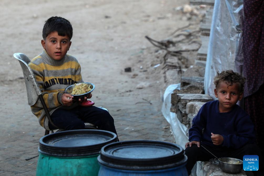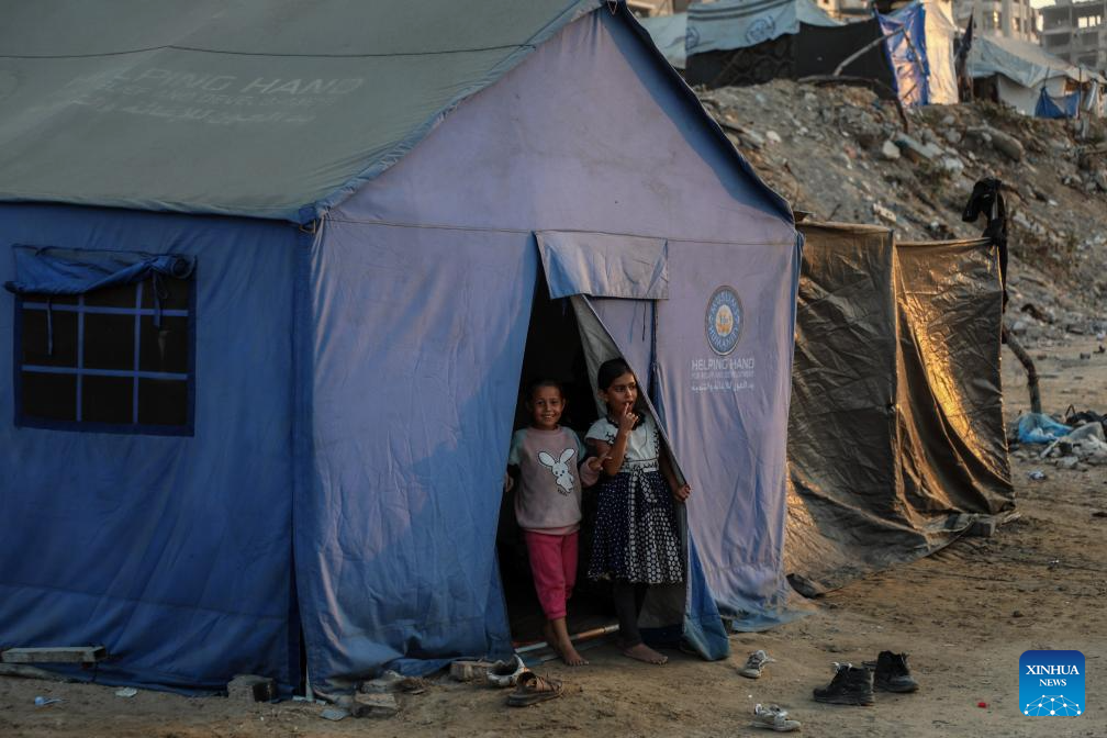 Palestinian children are pictured at a temporary shelter near the beach in west of Gaza City, Nov. 10, 2025. (Photo by Rizek Abdeljawad/Xinhua)