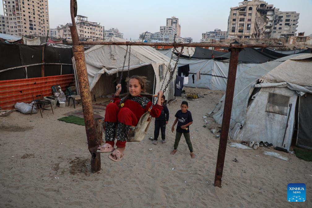 Palestinian children play at a temporary shelter near the beach in west of Gaza City, Nov. 10, 2025. (Photo by Rizek Abdeljawad/Xinhua)