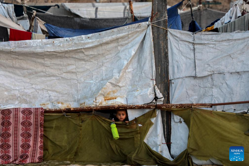 A Palestinian child is pictured at a temporary shelter near the beach in west of Gaza City, Nov. 10, 2025. (Photo by Rizek Abdeljawad/Xinhua)