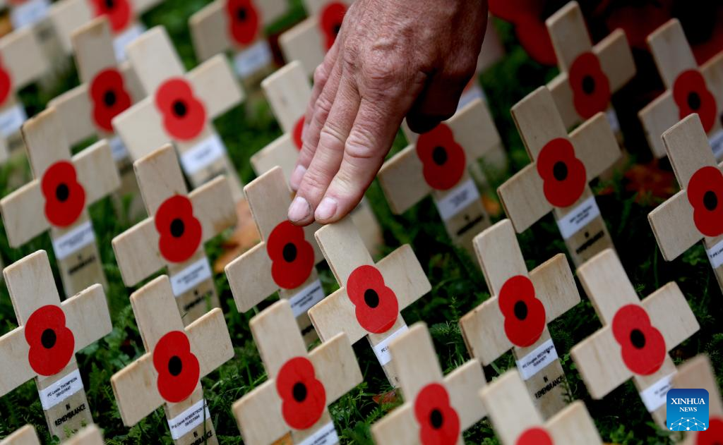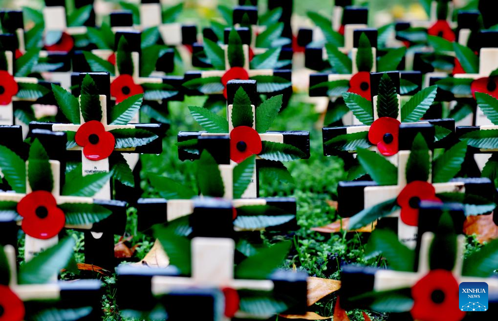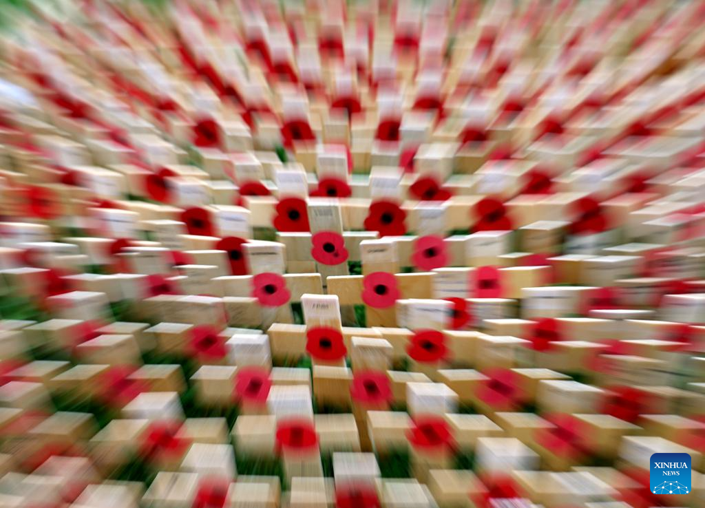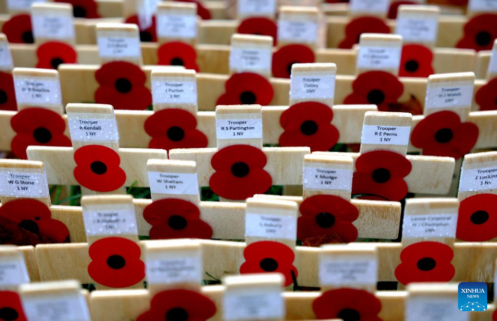 Poppy petals and crosses are seen at the Field of Remembrance on the occasion of Remembrance Day at Westminster Abbey in London, Britain, Nov. 10, 2025. Remembrance Day is observed to remember the sacrifices made by soldiers during the WWI, which ended on Nov. 11, 1918. (Xinhua/Li Ying)