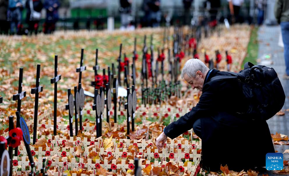 A man arranges poppy petals and crosses at the Field of Remembrance on the occasion of Remembrance Day at Westminster Abbey in London, Britain, Nov. 10, 2025. Remembrance Day is observed to remember the sacrifices made by soldiers during the WWI, which ended on Nov. 11, 1918. (Xinhua/Li Ying)