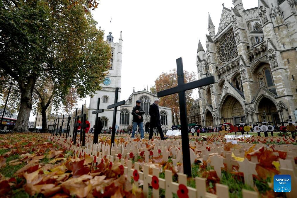 People walk past poppy petals and crosses at the Field of Remembrance on the occasion of Remembrance Day at Westminster Abbey in London, Britain, Nov. 10, 2025. Remembrance Day is observed to remember the sacrifices made by soldiers during the WWI, which ended on Nov. 11, 1918. (Xinhua/Li Ying)
