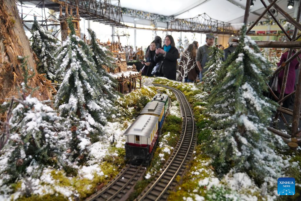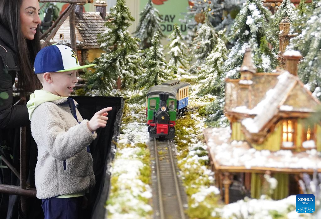 Visitors watch a model train during a preview of the Holiday Train Show at New York Botanical Garden in New York, the United States, on Nov. 11, 2025. A preview for the Holiday Train Show, which is open to the public from Nov. 15, 2025 to Jan. 11, 2026, was held at the New York Botanical Garden on Tuesday, showcasing large-scale model trains running in a miniature New York City where nearly 200 scaled iconic buildings and structures are recreated using bark, leaves and other natural materials. (Xinhua/Zhang Fengguo)