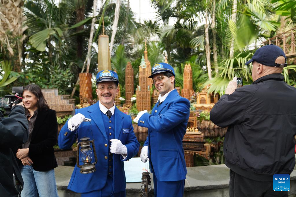 Staff members dressed up as train conductors greet visitors in front of the models of Manhattan buildings during a preview of the Holiday Train Show at New York Botanical Garden in New York, the United States, on Nov. 11, 2025. A preview for the Holiday Train Show, which is open to the public from Nov. 15, 2025 to Jan. 11, 2026, was held at the New York Botanical Garden on Tuesday, showcasing large-scale model trains running in a miniature New York City where nearly 200 scaled iconic buildings and structures are recreated using bark, leaves and other natural materials. (Xinhua/Zhang Fengguo)