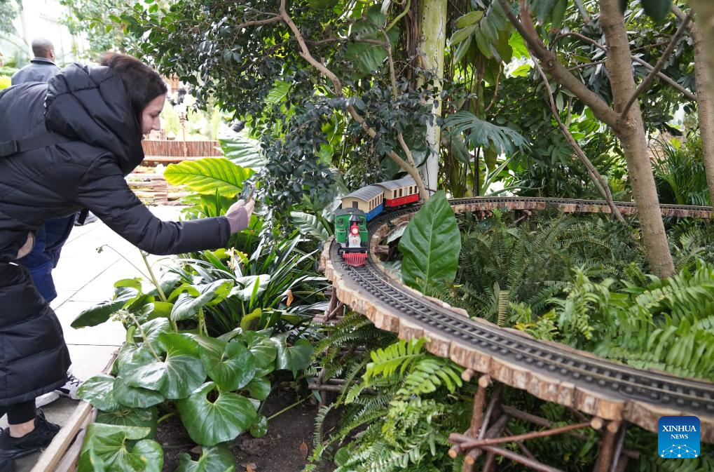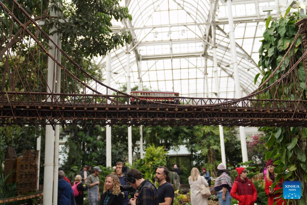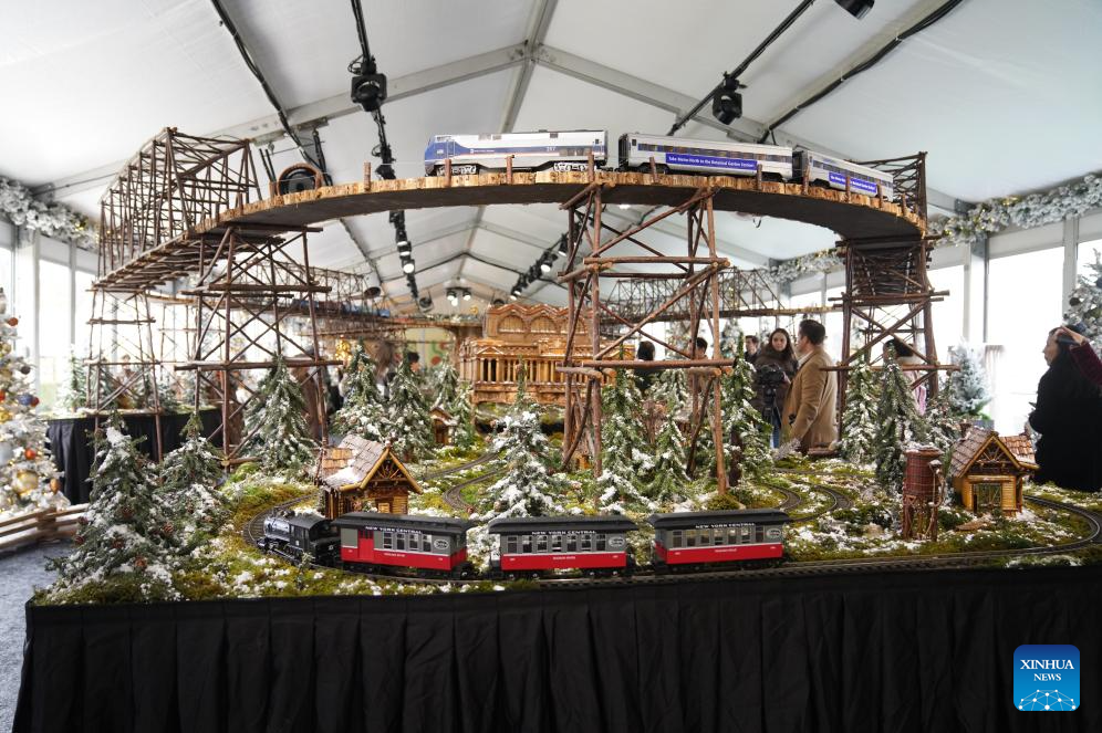 Visitors watch model trains during a preview of the Holiday Train Show at New York Botanical Garden in New York, the United States, on Nov. 11, 2025. A preview for the Holiday Train Show, which is open to the public from Nov. 15, 2025 to Jan. 11, 2026, was held at the New York Botanical Garden on Tuesday, showcasing large-scale model trains running in a miniature New York City where nearly 200 scaled iconic buildings and structures are recreated using bark, leaves and other natural materials. (Xinhua/Zhang Fengguo)
