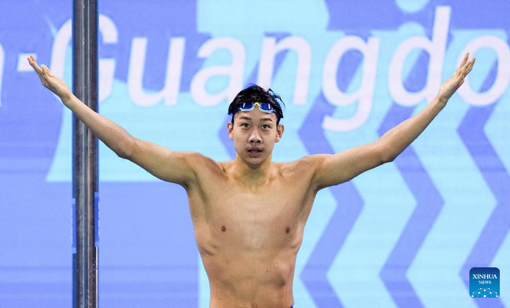 Zhang Zhanshuo of Shandong celebrates after the men's 200m freestyle final of swimming at China's 15th National Games in Shenzhen, south China's Guangdong Province, Nov. 12, 2025. (Xinhua/Xue Yuge)