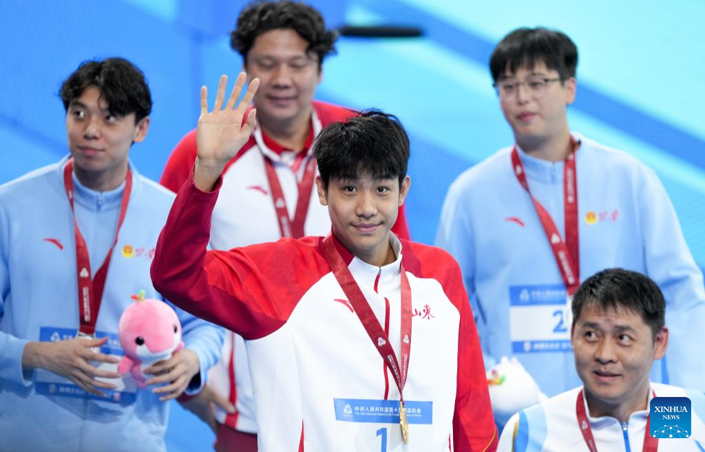 Gold medalist Zhang Zhanshuo of Shandong (front) greets the spectators after the awarding ceremony for the men's 200m freestyle of swimming at China's 15th National Games in Shenzhen, south China's Guangdong Province, Nov. 12, 2025. (Xinhua/Du Yu)