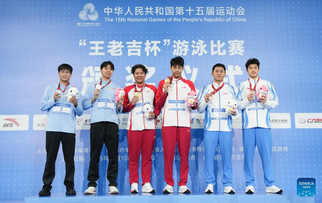 Gold medalist Zhang Zhanshuo of Shandong, silver medalist Ji Xinjie of Gongan, bronze medalist Pan Zhanle of Zhejiang pose with their coaches during the awarding ceremony after the men's 200m freestyle final of swimming at China's 15th National Games in Shenzhen, south China's Guangdong Province, Nov. 12, 2025. (Xinhua/Xue Yuge)