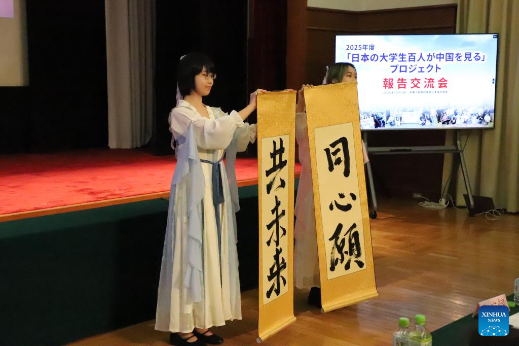 Students from China and Japan display their calligraphy works at the report exchange meeting of the "Hundred Japanese University Students Visit China" program in Tokyo, Japan, Nov. 11, 2025. The report exchange meeting of the "Hundred Japanese University Students Visit China" program was held in Tokyo on Tuesday, as over 100 participants gathered to discuss youth exchanges and cooperation between the two countries.