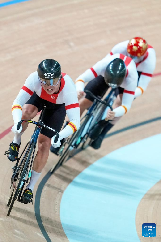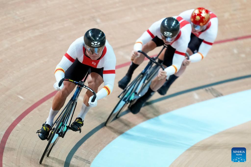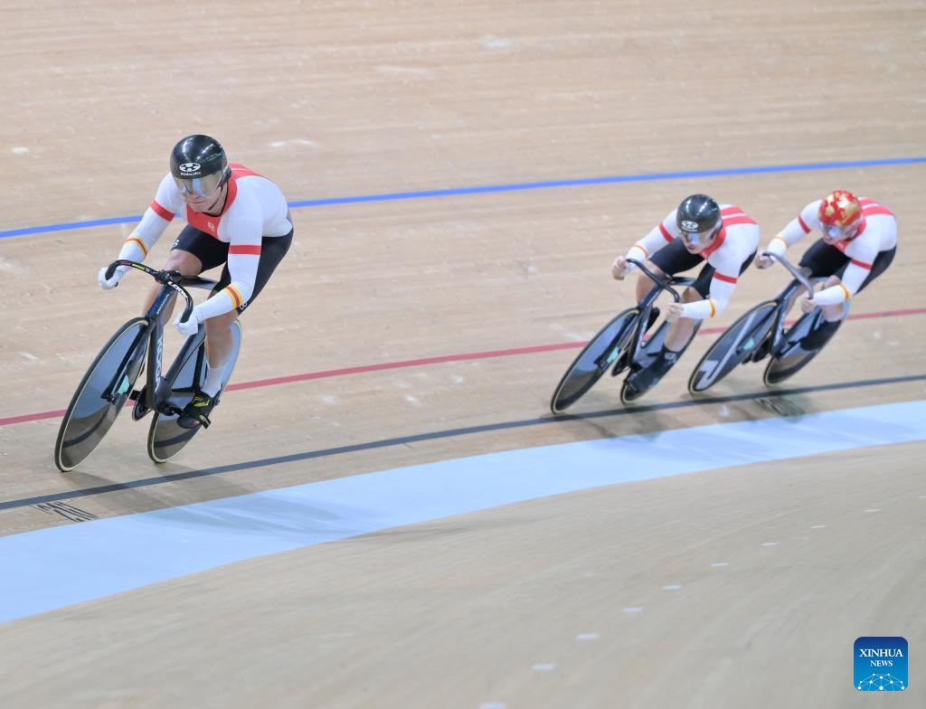 Athletes of team Henan compete during the cycling track men's team sprint final at China's 15th National Games in Hong Kong, south China, Nov. 13, 2025. (Xinhua/Hu Huhu)