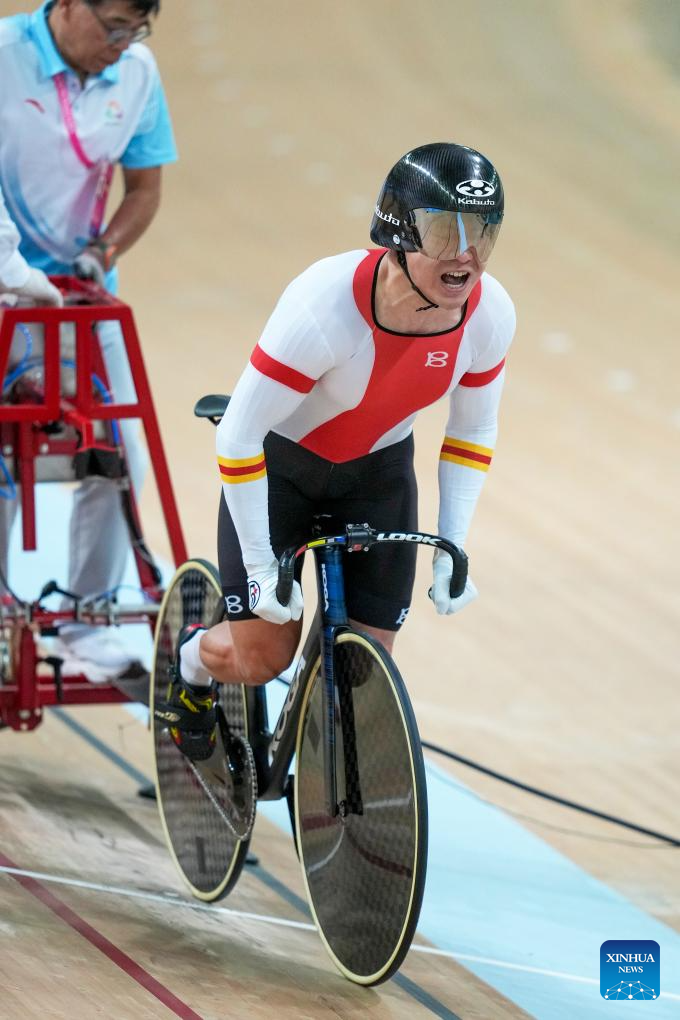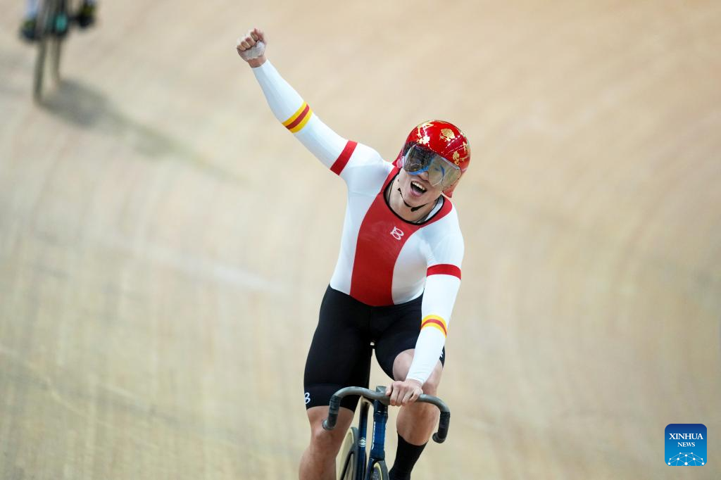 Liu Qi of team Henan celebrates after winning the cycling track men's team sprint final at China's 15th National Games in Hong Kong, south China, Nov. 13, 2025. (Xinhua/Wu Lu)