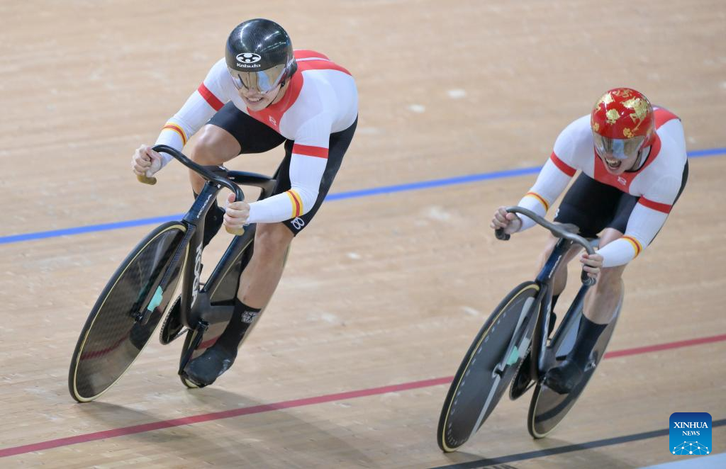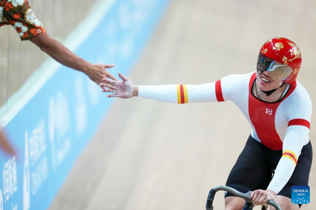 Liu Qi of team Henan gives high-five after winning the cycling track men's team sprint final at China's 15th National Games in Hong Kong, south China, Nov. 13, 2025. (Xinhua/Wu Lu)