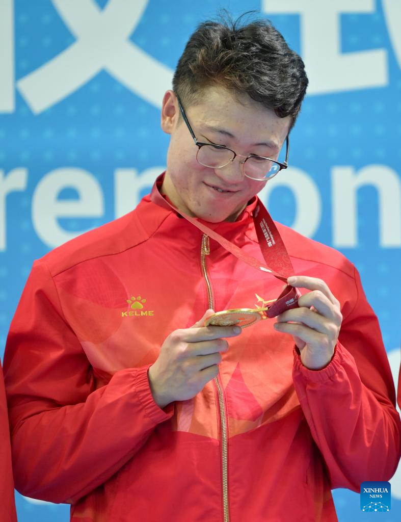 Liu Qi of Henan reacts during the awarding ceremony for cycling track men's team sprint at China's 15th National Games in Hong Kong, south China, Nov. 13, 2025. (Xinhua/Hu Huhu)