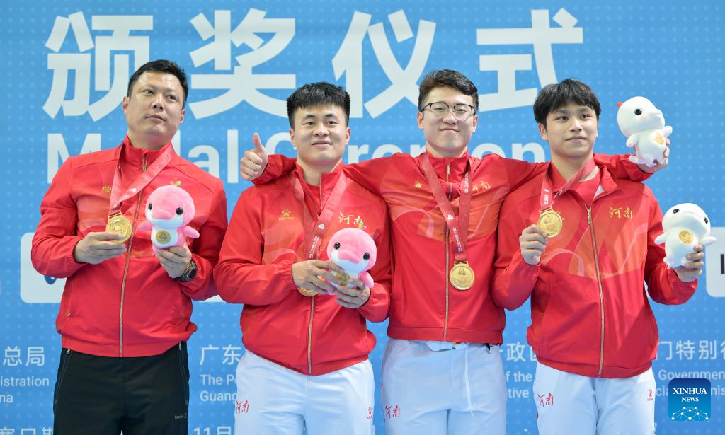 Gold medalists team Henan pose during the awarding ceremony for cycling track men's team sprint at China's 15th National Games in Hong Kong, south China, Nov. 13, 2025. (Xinhua/Hu Huhu)