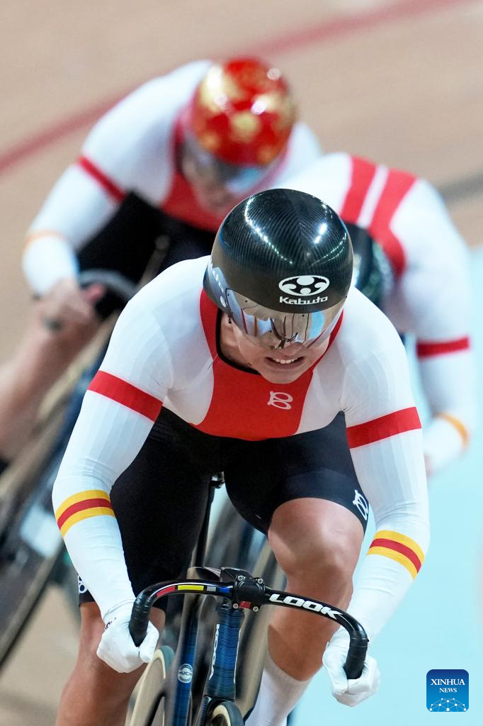 Tang Haoju of team Henan starts during the cycling track men's team sprint final at China's 15th National Games in Hong Kong, south China, Nov. 13, 2025. (Xinhua/Wu Lu)
