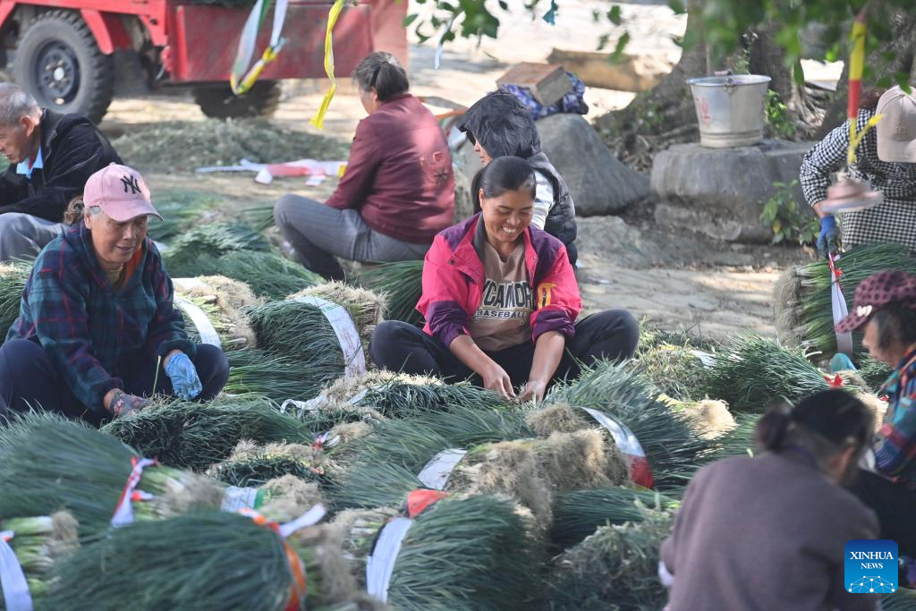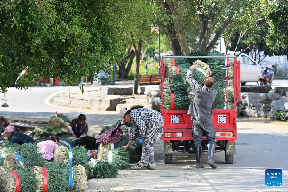 Villagers transfer chive bundles for sale in Jueshan Village of Sandu Town in Liuzhou City, south China's Guangxi Zhuang Autonomous Region, Oct. 28, 2025. Sandu Town has in recent years promoted the standardized and industrialized production of chives, and developed an integrated business system that ranges from planting and processing to sales and service.