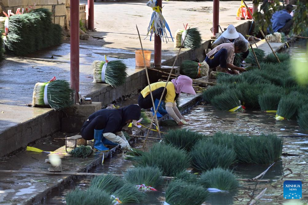 Villagers clean harvested chives in Jueshan Village of Sandu Town in Liuzhou City, south China's Guangxi Zhuang Autonomous Region, Oct. 28, 2025. Sandu Town has in recent years promoted the standardized and industrialized production of chives, and developed an integrated business system that ranges from planting and processing to sales and service.