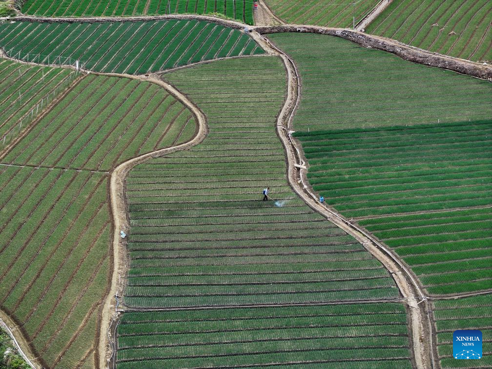 An aerial drone photo taken on Nov. 11, 2025 shows a chive planting demonstration base in Sandu Town of Liuzhou City, south China's Guangxi Zhuang Autonomous Region. Sandu Town has in recent years promoted the standardized and industrialized production of chives, and developed an integrated business system that ranges from planting and processing to sales and service.