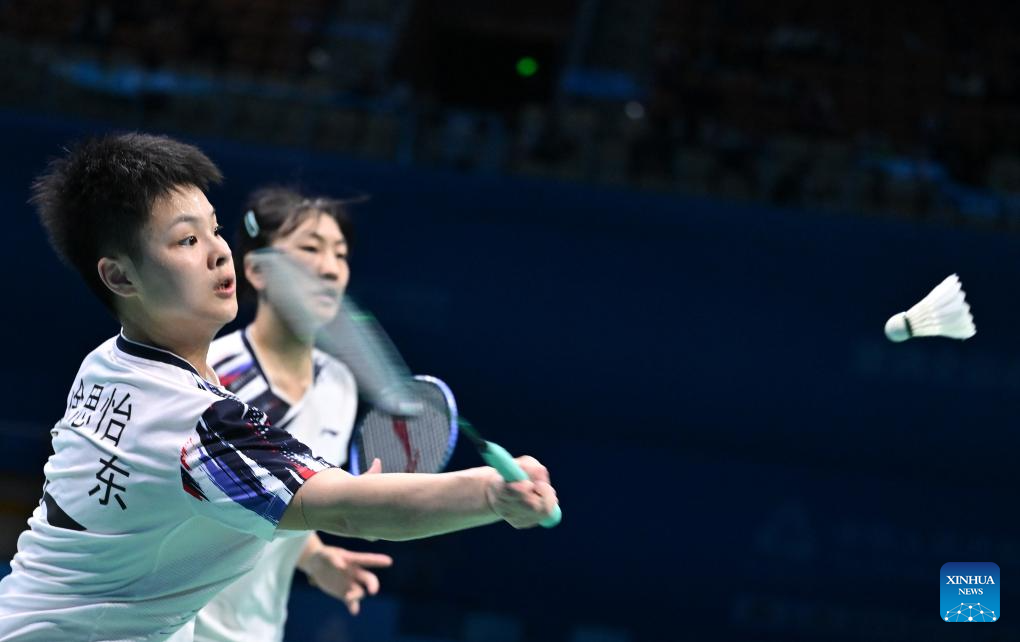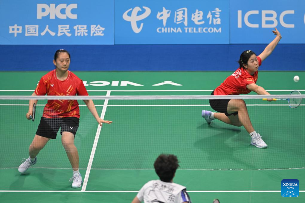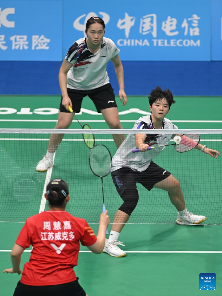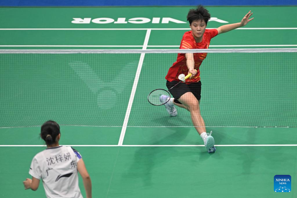 Qin Tianyue/Shi Sichen of Jiangsu compete against Wei Yueyue/Xu Siyi of Guangdong during the U18 women's team final of badminton between Jiangsu and Guangdong at China's 15th National Games in Shenzhen, south China's Guangdong Province, Nov. 13, 2025. (Xinhua/Zhang Long)