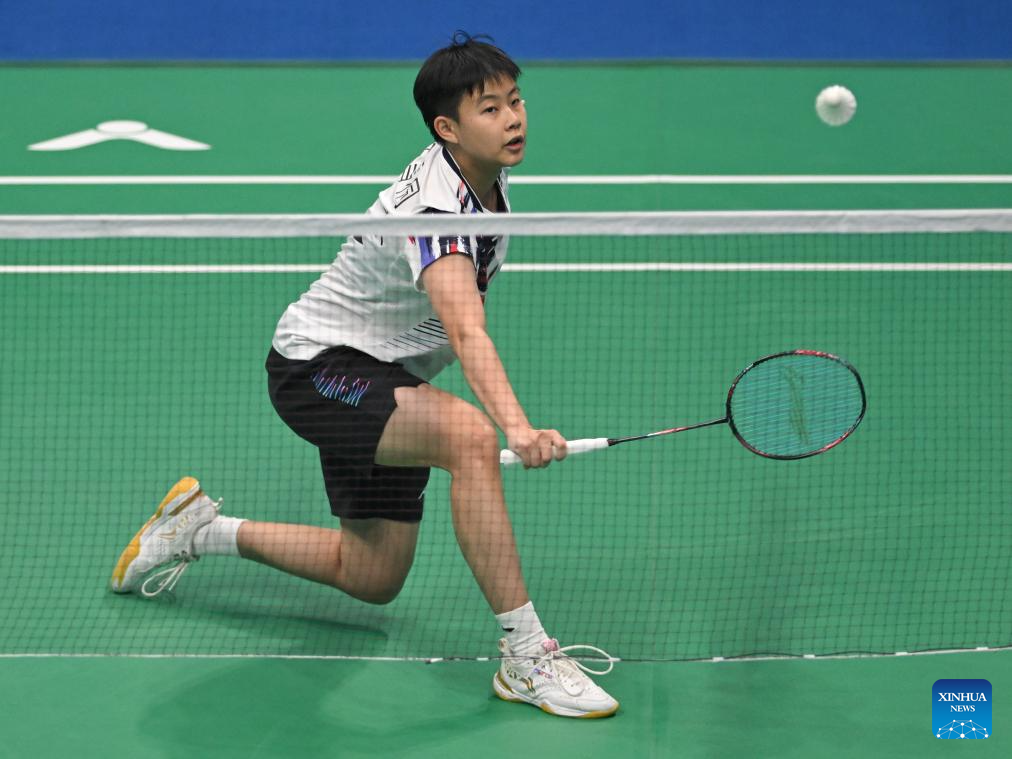 Xu Wenjing of Jiangsu competes against Shen Ziyan of Guangdong during the U18 women's team final of badminton between Jiangsu and Guangdong at China's 15th National Games in Shenzhen, south China's Guangdong Province, Nov. 13, 2025. (Xinhua/Zhang Long)