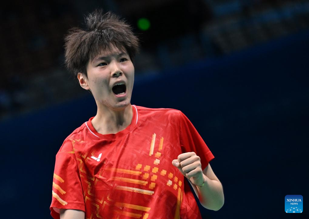Xu Wenjing of Jiangsu reacts while competing against Shen Ziyan of Guangdong during the U18 women's team final of badminton between Jiangsu and Guangdong at China's 15th National Games in Shenzhen, south China's Guangdong Province, Nov. 13, 2025. (Xinhua/Li He)