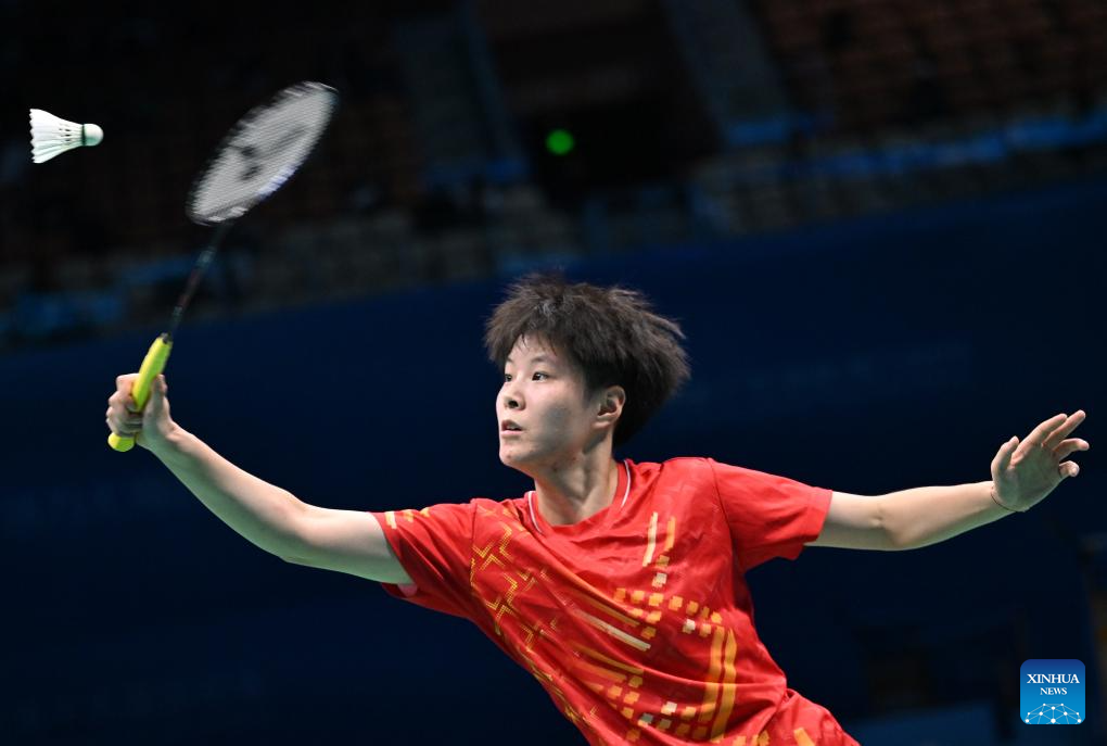Wu Xuetong of Guangdong competes against Zhang Leyao of Jiangsu during the U18 women's team final of badminton between Jiangsu and Guangdong at China's 15th National Games in Shenzhen, south China's Guangdong Province, Nov. 13, 2025. (Xinhua/Zhang Long)