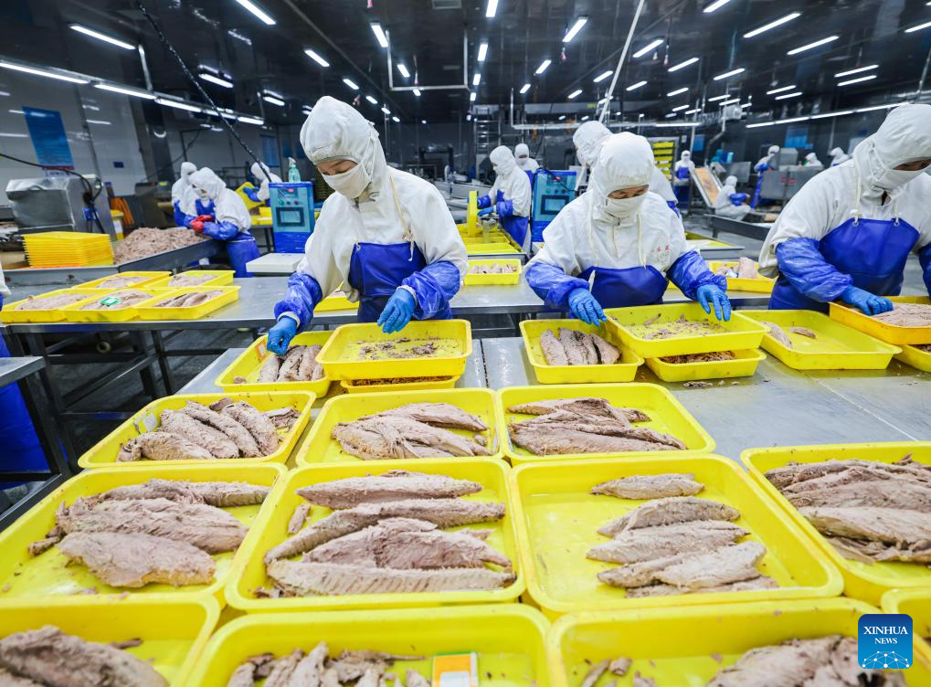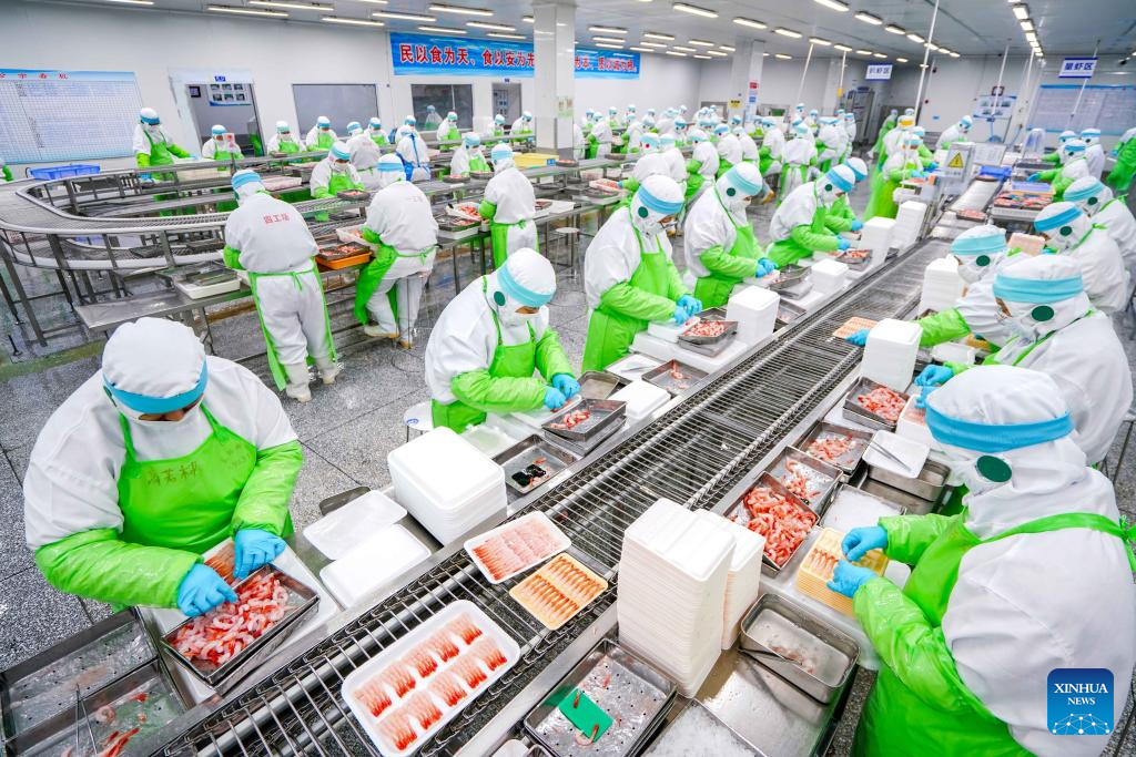 Workers process tuna products at a seafood processing enterprise in Rongcheng City, east China's Shandong Province, Nov. 12, 2025. As a province noted for its major marine fishery economy, Shandong has been actively building marine farms in recent years, aiming to continuously enrich the "blue food depot."