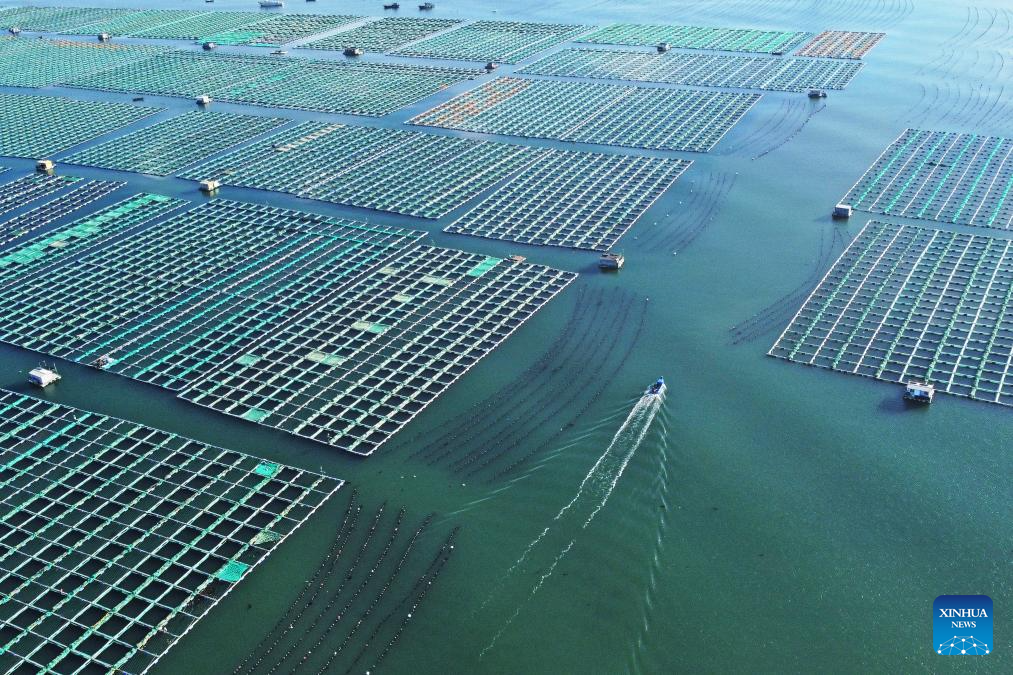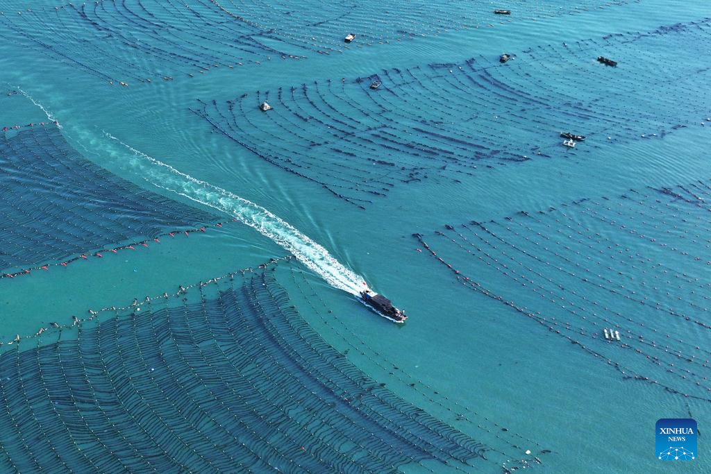 An aerial drone photo taken on Nov. 11, 2025 shows a fisherman patrolling at a breeding area in Tianheng Township of Jimo District, Qingdao City, east China's Shandong Province. As a province noted for its major marine fishery economy, Shandong has been actively building marine farms in recent years, aiming to continuously enrich the "blue food depot."