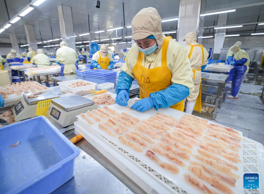 Workers process cod products at an aquatic products processing enterprise in Lidao Township, Rongcheng City, east China's Shandong Province, Nov. 10, 2025. As a province noted for its major marine fishery economy, Shandong has been actively building marine farms in recent years, aiming to continuously enrich the "blue food depot."