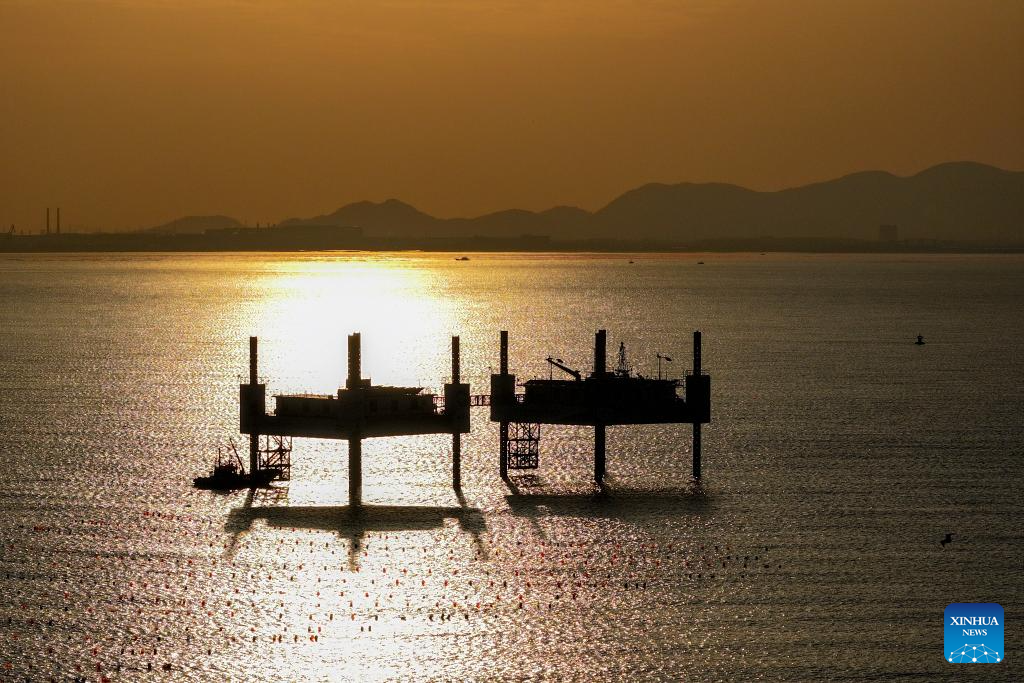 An aerial drone photo taken on Nov. 10, 2025 shows a marine farm at Taoluo Township of Donggang District in Rizhao City, east China's Shandong Province. As a province noted for its major marine fishery economy, Shandong has been actively building marine farms in recent years, aiming to continuously enrich the "blue food depot."