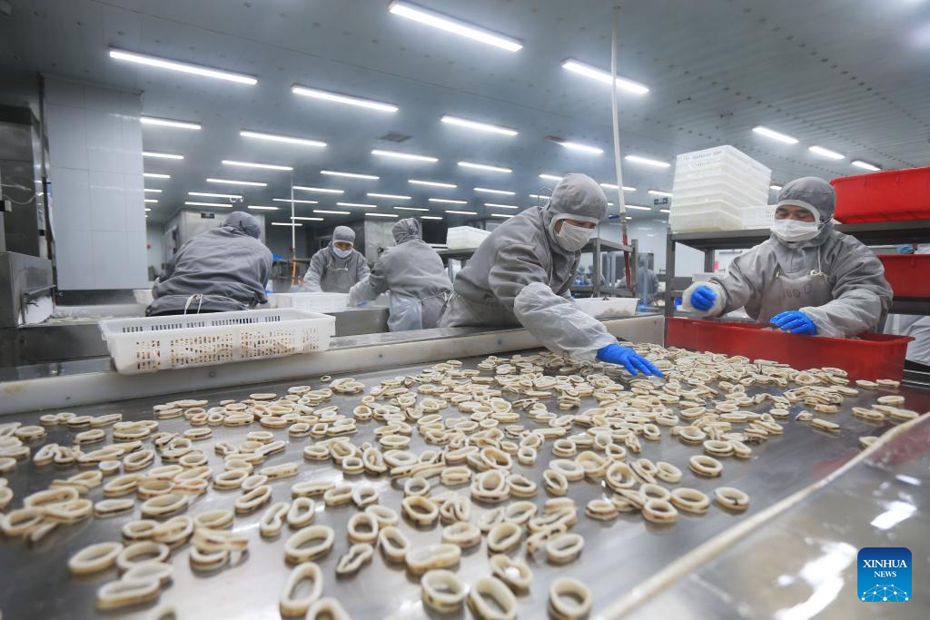 Workers process squid products at a seafood processing factory in Rongcheng City, east China's Shandong Province, Nov. 10, 2025. As a province noted for its major marine fishery economy, Shandong has been actively building marine farms in recent years, aiming to continuously enrich the "blue food depot."