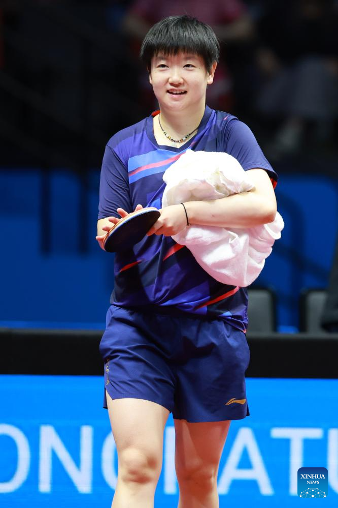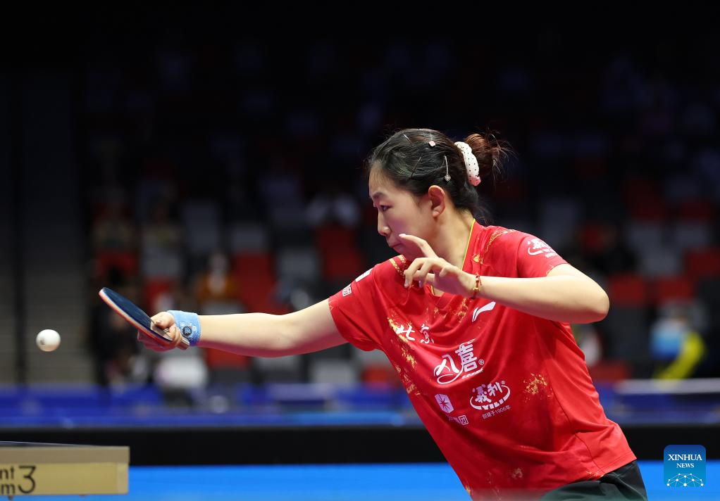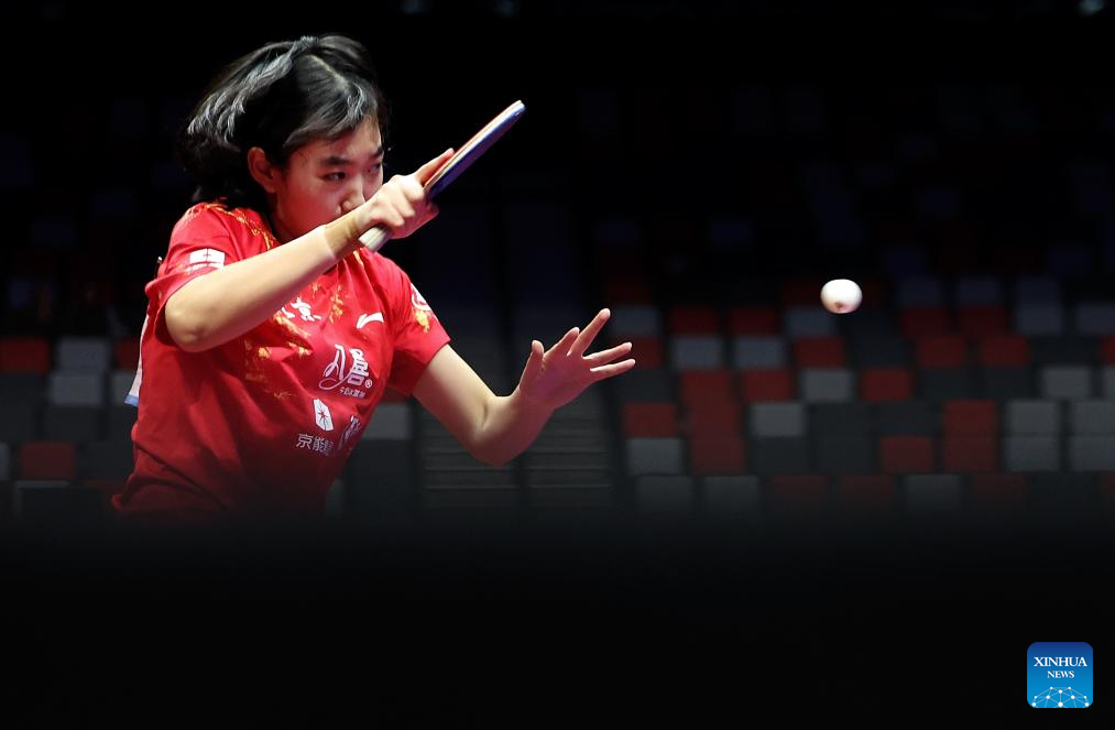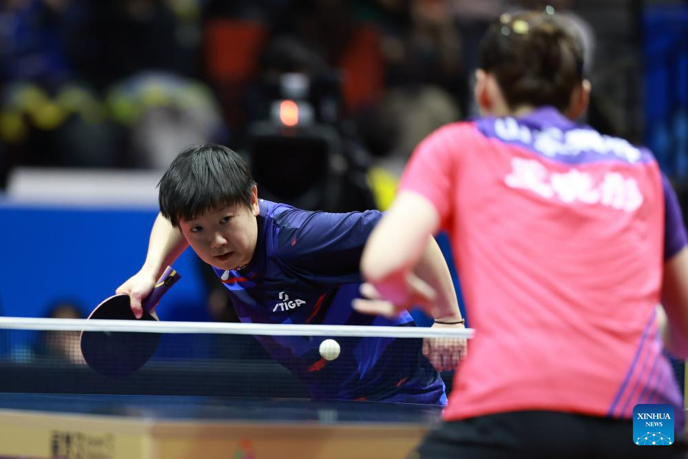 He Zhuojia hits a return during the table tennis women's singles round of 16 match between Chen Meng of Shandong and He Zhuojia of Hebei at China's 15th National Games in Macao, south China, Nov. 12, 2025. (Xinhua/Liu Xu)