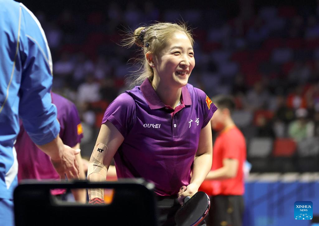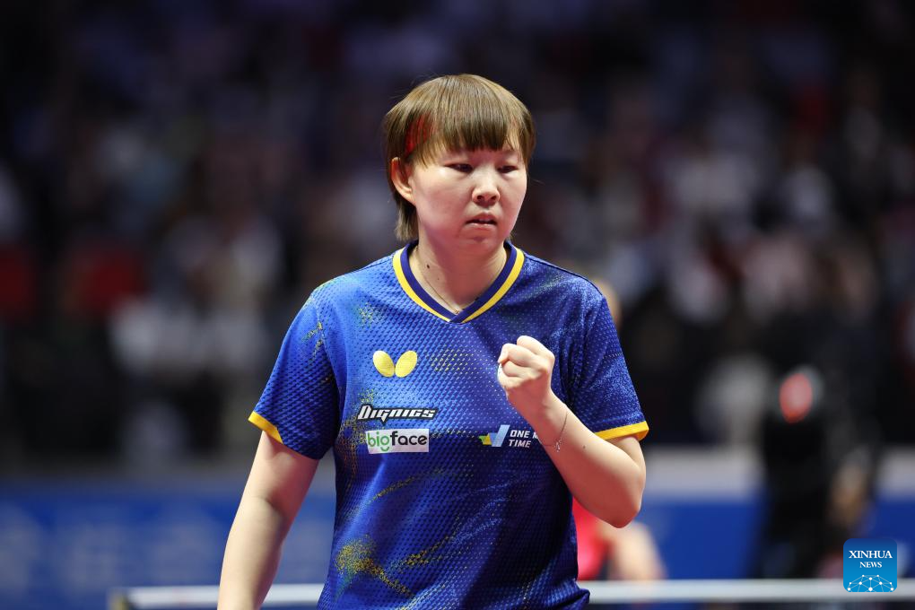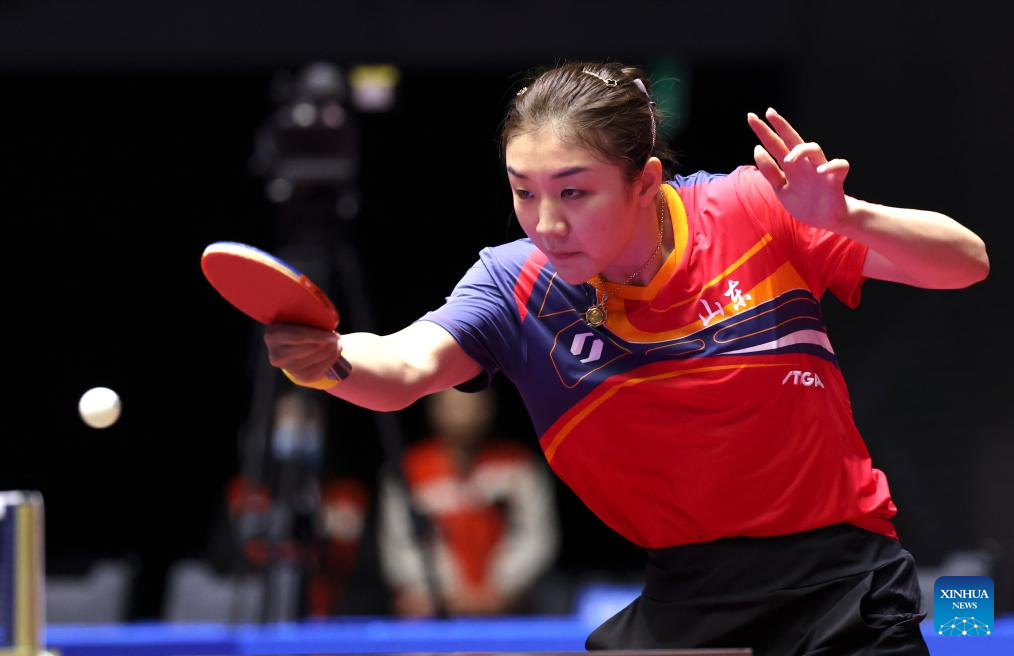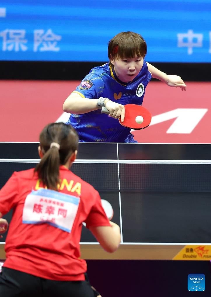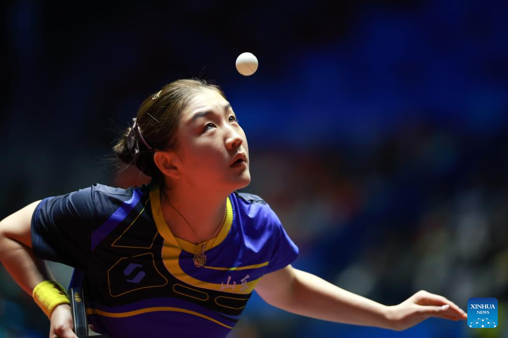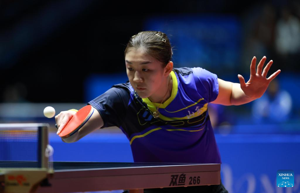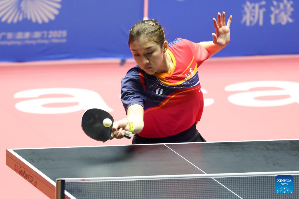 Chen Meng hits a return during the table tennis women's singles round of 16 match between Chen Meng of Shandong and He Zhuojia of Hebei at China's 15th National Games in Macao, south China, Nov. 12, 2025. (Xinhua/Liu Xu)