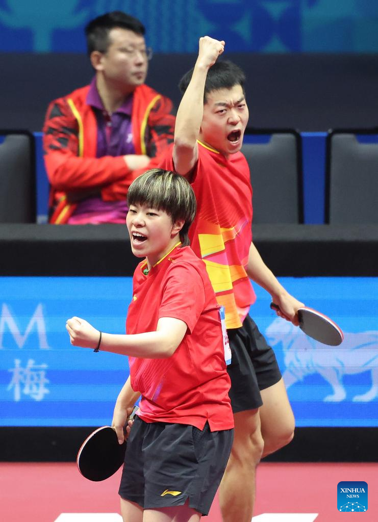 Lin Gaoyuan (L)/Liu Shiwen (R) celebrate scoring during the table tennis mixed doubles semifinal match between Lin Gaoyuan/Liu Shiwen of Guangdong and Yuan Licen/Wang Yidi of Liaoning at China's 15th National Games in Macao, south China, Nov. 13, 2025. (Xinhua/Chen Bin)