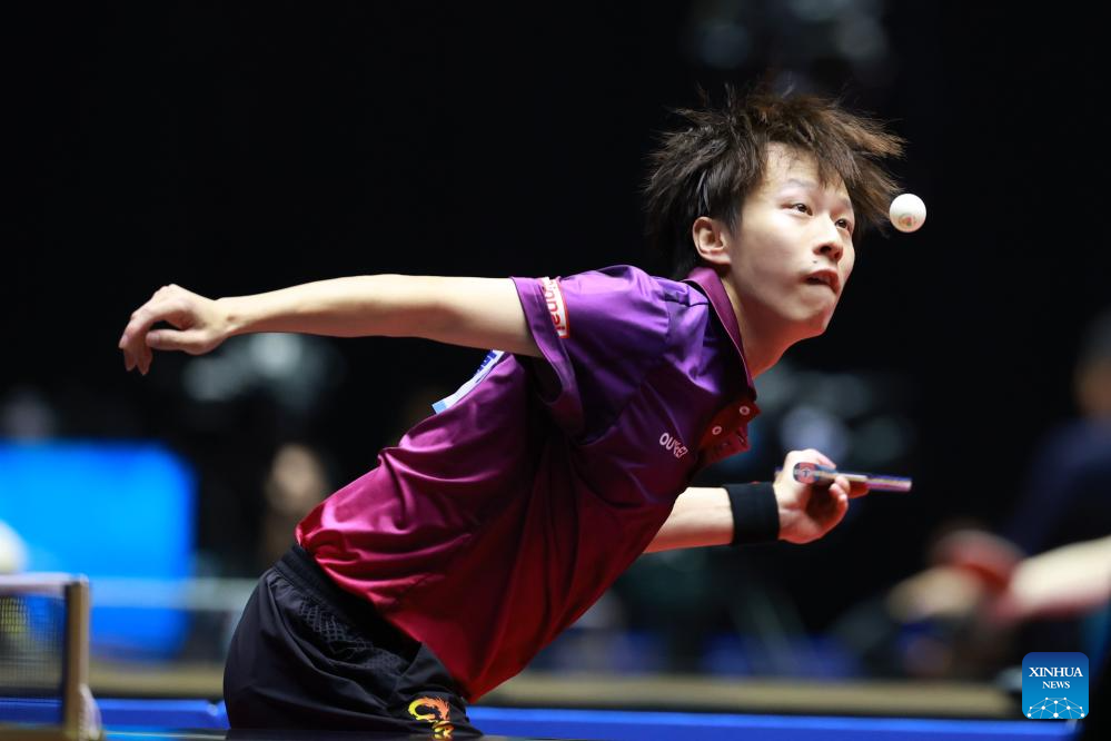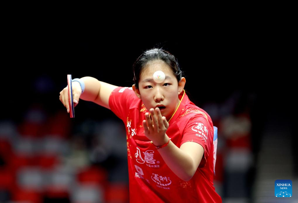 Chen Xingtong hits a return during the table tennis women's singles round of 16 match between Chen Xingtong of Liaoning and Zang Xiaotong of Hebei at China's 15th National Games in Macao, south China, Nov. 12, 2025. (Xinhua/Liu Xu)